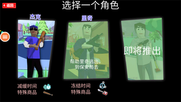 4、多种角色可以选择,每个角色都有独特的外观和技能,玩家可以根据自己的喜好选择角色,体验不同的风格。1、使用左下角的虚拟摇杆移动位置,点击箭头来变换武器,使用手机用来买车,点击时间按钮可以让时间慢下来。