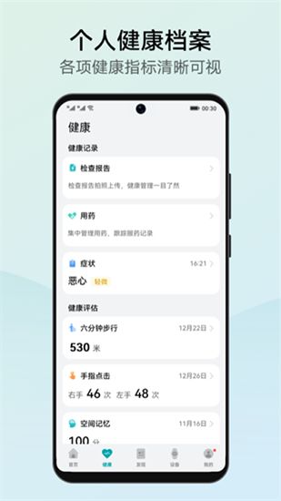 2、健康指标记录:配合华为穿戴设备,帮您记录心脏健康、血管健康、肝脏脂肪健康、唿吸健康、睡眠、单次运动、血氧、心率、体温、体脂等多维度健康指标。