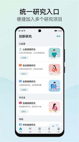 华为创新研究app是华为旗下推出的一款专业的健康管理应用,通过软件内置的专业健康科普功能,您每天都能获取到科学、实用的健康知识,包含饮食、运动和疾病预防等多种方面。该应用还提供了统一的研究入口,用户可以加入多个由华为及专业机构发起的健康研究项目,参与其中并为健康研究贡献自己的数据。