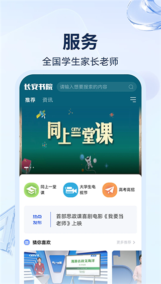 长安书院app是一款功能非常强大的视频直播教育软件,软件整合了权威的教育资讯,用户可以在这里选择自己需要学习的内容,还有着各种各样的教育资讯,让你可以在这里掌握更多有关教育方面的信息,而且软件中的内容非常丰富,可以说涵盖了生活中的方方面面,能够为孩子带来很好的教育。同时,这里还有着各种各样的教育直播和视频,让孩子观看可以让他们了解更多的信息,如学习,生活等,并为他们树立正确的价值观。