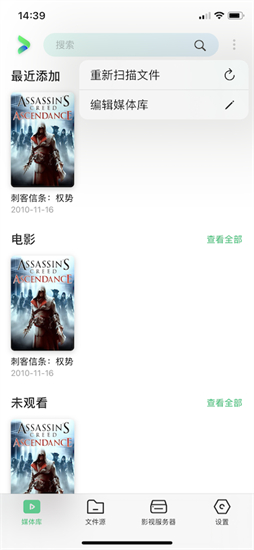 6、内置媒体库管理工具,具有用于显示视频的直观界面以及按类型、日期、评级等可自定义的排序选项。媒体库:展示的所有影片全部来自于“文件源”里的视频文件,当你添加了新的文件夹作为文件源后,会自动搜索刮削该文件源下的所有视频文件并添加到媒体库中。