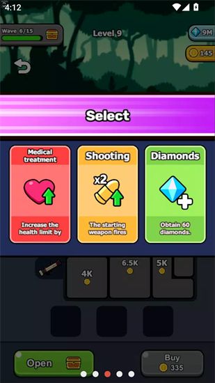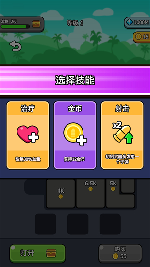 3、游戏中,玩家还可以自由选择获得技能或奖励,如治疗、金币、射击*2等。