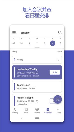 此外,teams手机版app还提供了面对面连接功能,支持高清视频会议,用户可以随时随地加入在线会议,查看详细的日程安排,确保不错过任何重要活动。软件将团队对话和内容整合在一个界面中,方便快速访问和管理,无论是项目讨论还是日常沟通,都能在一个平台上完成,有兴趣的朋友欢迎前来下载体验。2、会议:支持共享屏幕、改变或模糊背景以及使用同框场景模式,让大家处于同一个虚拟空间。