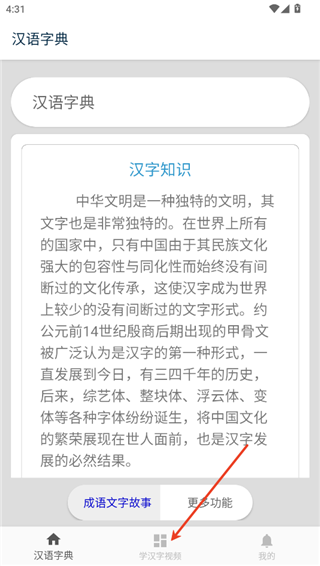 汉语字典免费版是一款大型的汉语言学习软件,汉字作为中国独有的文化,是每一位国人需要学习的,软件收录了上万个汉字和丰富的词组,让用户可以在这里进行学习。软件中所有的汉字都有着对应的视频教学,通过简短的视频教学可以让用户更好的进行学习,而且针对于小孩的喜好,特意采用的是动漫的形式,从而更好的吸引孩子们的注意,让孩子可以在快乐中学习汉字,视频会从注音,拼音,笔画等多个方面进行讲解,让每一位孩子对于汉字的了解更加深入。