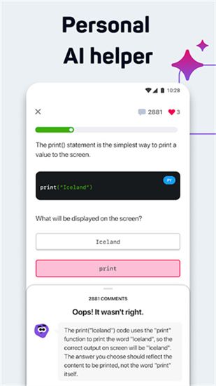 2、创造:使用专属的AI平台和移动代码编译器进行练习、创造和设计!无论您身在何处,都可以通过手机尝试生成式人工智能并创建代码。在课程中练习新技能,或者尝试创建可以实际运行并与他人分享的简单游戏和网站。您可以随时随地直接在 Sololearn 中创建 Python、Java、HTML、JavaScript、C++、C#、CSS、TypeScript、Kotlin、PHP、Swift、C、Node.js、Go、R、Ruby、Angular 和 jQuery 代码,只要你有手机!