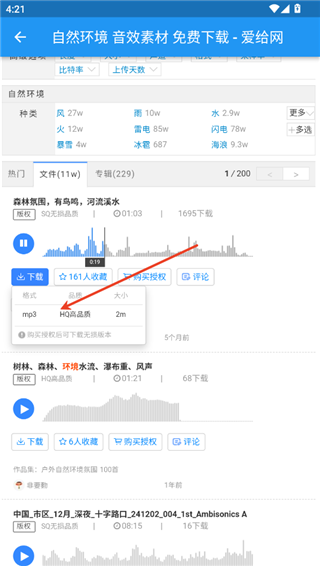 同时爱给网app还准备了筛选功能,用户可以根据自己的需要来设置筛选条件,快速找到符合的素材。用户可以在这里浏览各种各样的素材,看到喜欢的素材可以点击收藏或是直接下载,收藏与下载被分成了两个版块,方便用户日后寻找素材,此外,用户还可以在这里上传自己的作品,通过平台审核之后就可以正式发布了。
