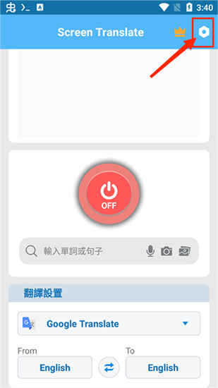 4、同时支持双向翻译,自动翻译剪贴簿等功能,保证带给你体贴方便的翻译新体验。1、首先点击界面右上角的设置按钮,如下图。