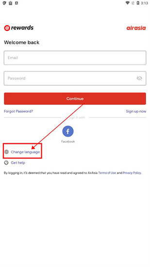 1、打开从本站下载的,亚洲航空APP官方版,进入登录页后选择“Change language”(语言切换)。