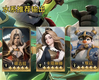 高输出能力:这三位英雄应都具备较强的水系伤害输出技能,能对敌方造成可观伤害,德古拉和卡塔琳娜形象较为冷峻,可能是强力单体或群体输出角色;维达之前在新手队出现过,在这里作为输出,也有一定的伤害能力。