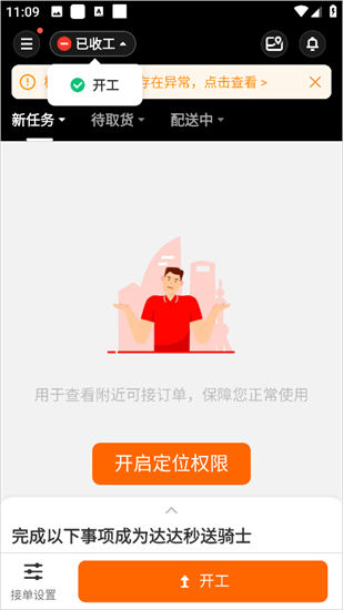 3、等注册成功后,直接点击京东外卖骑手App左上角的开工,你就可以开始接单了。