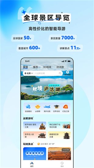 同时,旅途随身听app官方版引入了3D地球功能,展示全球景点,让游客可以在虚拟环境中玩转全球景点,将旅途与知识完美融合。软件还提供了丰富的古典诗词和故事情景再现功能,通过国风画面和生动的讲解,让用户在赏美景时,也能体悟到深厚的文化底蕴,实现寓教于乐的效果。2、景区数量7000+。