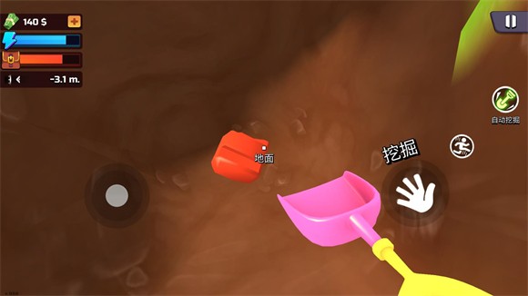 2、不停地往地底下挖,挖出物品能自动收到你的包裹中,不过每次挖掘都会消耗你的体力,体力条空后就需要返回地面了。
