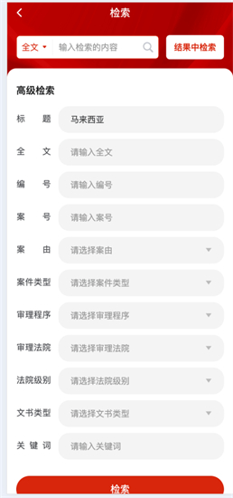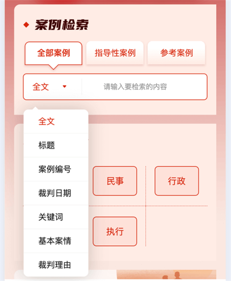 2、分段检索:直接点击全文下拉框,可定位在全文、标题、案例编号、发布日期、关键词、基本案情、裁判理由段中进行检索。