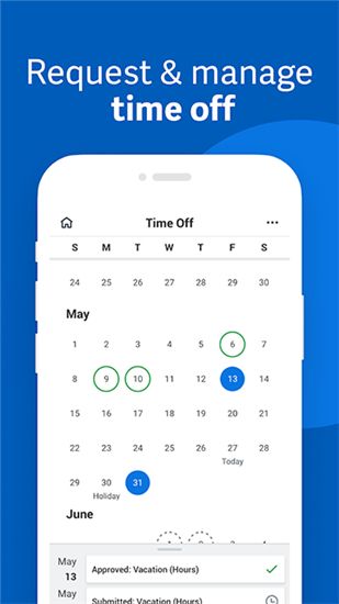 4、快速查看薪资、查看或申请短期休假、工作打卡、提交工时表以及提交费用报告。5、接收关于考勤、重要更新以及审批的推送通知、警报和提醒。使用Workday官方应用立即执行操作。