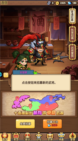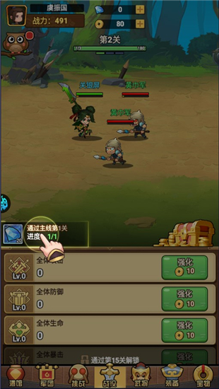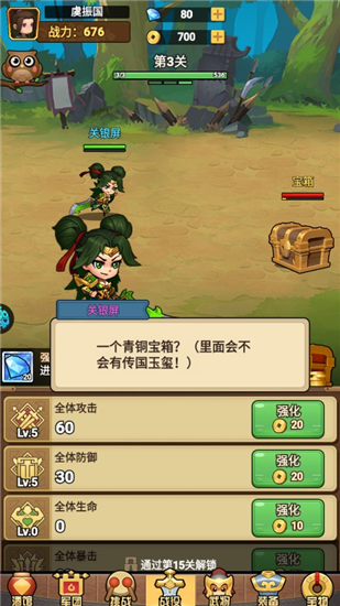 勇闯三国是全新上线的一款三国题材的Q版国风休闲挂机游戏,该游戏制作精良,在传统的休闲放置玩法基础上融入了新颖的开箱元素,超多丰富的活动玩法旨在带给玩家们与众不同的全新体验。进入游戏,玩家只需通过简单点击即可增加角色攻击、防御与生命值,自动战斗的挂机玩法,无需玩家操作即可自动杀敌闯关。每完成一个任务或是关卡闯关,都可获得丰富的经营及宝箱奖励。随机掉落的不同颜色宝箱,内容都各不相同,可带给玩家更多未知的开箱惊喜。
