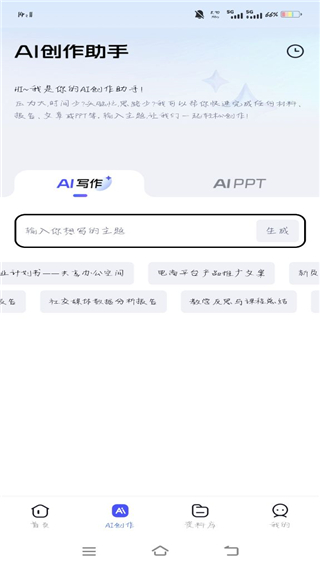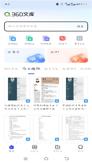 在360文库中,没有写作思路,时间不够或是其他的问题都不用担心,这里为用户带来了AI创作助手,有AI写作和AIPPT两种功能,可以根据用户给出的要求来写出对应的内容或是制作成PPT,轻轻松松完成创作。