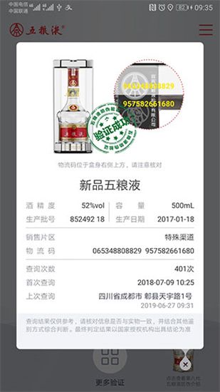 五粮液防伪app官方最新版是一款专业的五粮液防伪验证软件,提供了NFC验证、二维码验证、电码验证登方式,让大家能够安心购买正版美酒。用户只需要使用带有NFC功能的手机,将手机的NFC区域紧紧紧地贴在五粮液盒盖的中间部位,即可快速地对其进行真假验证,更加详细具体的使用问题和其他验证方式可以在APP中自行查看,有需要的朋友欢迎前来本站下载五粮液防伪查询app。