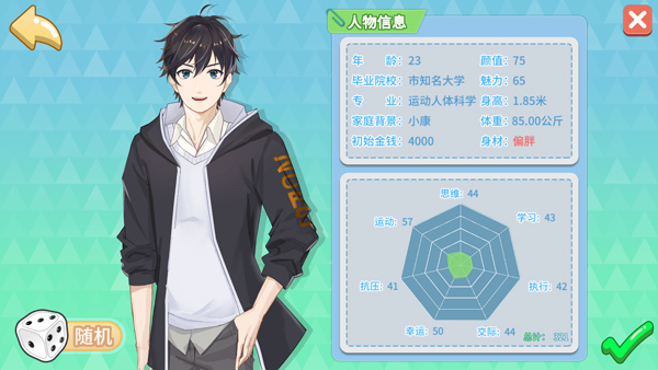 1、首先,打开从本站下载的职场浮生记游戏,从简单、普通、困难三个游戏难度中选择一个,并确认自己的角色信息。