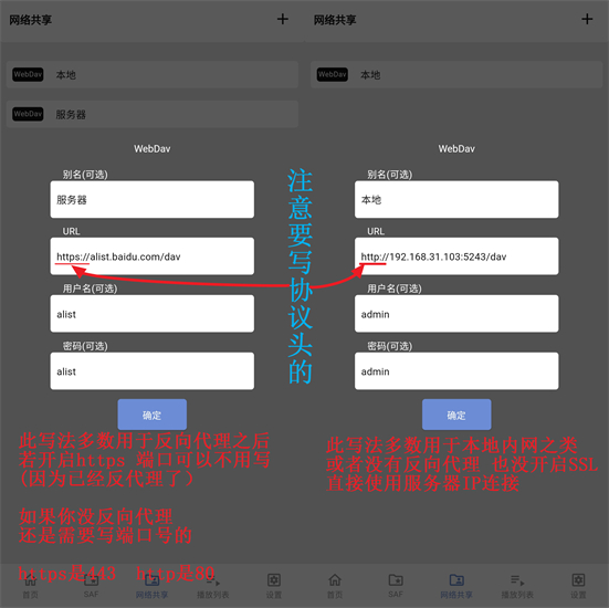 举几个填写WebDav示例,账号密码就是你AList用户的账号密码,基本是这个写法,软件不同写法也可能不同,如果没有单独留路径选项那正常就是在 站点后面添加/dav选项。