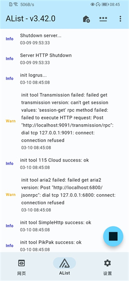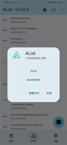 3、接着,点击左下角【网页】,登录alist,添加网盘。同一局域网设备可以访问http://[手机局域网IP]:5244,具体设置方法与Coreelec下一样,参考官方文档https://alist.nn.ci/zh/guide/。注意,核心是要取得网盘的令牌或者Authorization。
