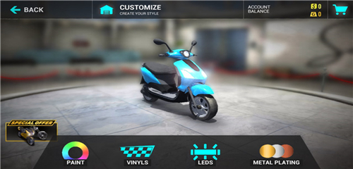 同时,游戏中为玩家准备了多种操作模式,轮盘操作,重力操作和按键操作,你可以根据自己的习惯来进行选择,从而快速上手游戏。在川崎h2游戏中,还为玩家准备了定制车辆玩法,你可以对自己的赛车进行改装,如喷漆,部件升级,灯光颜色,漂移痕迹等,从而打造专属于自己的个性化摩托车,不过改装是需要消耗一定金币的,所以在改装之前要多多参加比赛,以此来获得足够的金币。