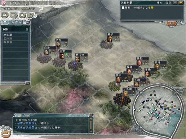 单挑可多人对战,在战斗中可通过指令“交代”换人,因此群战时交代的时机也很重要,掌握好交代的时机往往是左右胜负的关键。不过第一次换人的时间则是电脑决定的,与武将关系有关,总之武将关系越好换人时间越快。单挑至50回合不分胜负即以平手告终。单挑时,可选择攻击重视、防御重视、斗志重视和一发重视。