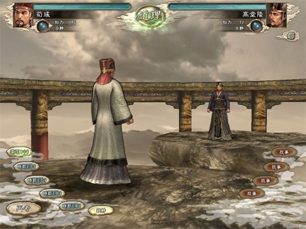舌战时话题分故事、道理、时节三种,每种又分大、中、小三种强度,毋庸置疑,大>;中>;小,选择强度大的话题会使选择强度小的一方心理槽受到伤害,如强度相同则双方都不会受到伤害。不过舌战时会规定某一话题,如果选择的话题并非所给定话题,那么即使话题强度胜于对方也无济于事,仍然会受到伤害。如果双方给出的话题都不是所规定的话题,则仍按照大>;中>;小的规律决胜。