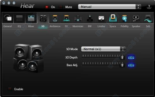 3、手动模式自带了EQ,Mixer,3D,Ambience,FX,Maximizer,BW,Limiter,Space,Fidelity,Speaker,Sub十二种专业音
