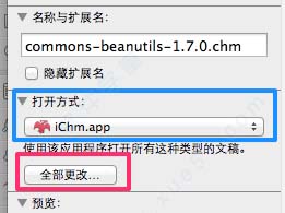 2、iCHM设置为默认CHM文件浏览工具任选一个CHM文件,按快捷键:Command + I,将会显示文件的信息,在打开方式中,选择,然后点击<全部更改>,这样以后直接双击CHM文件就会默认以iCHM打开。