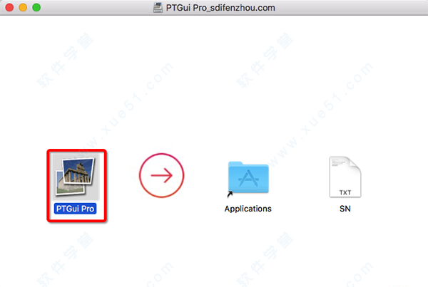 1、打开dmg镜像文件,将软件“ptgui Pro”拖入应用程序中进行安装;
