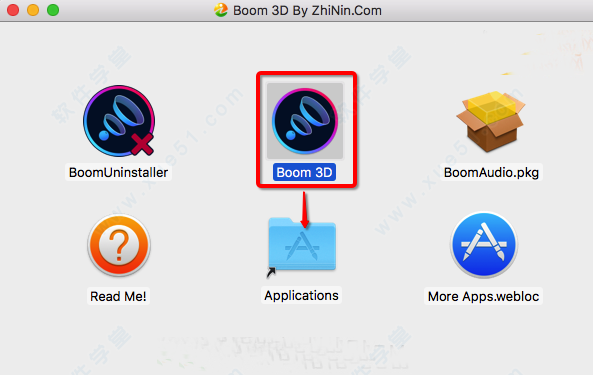 1、打开dmg镜像文件,将软件“boom 3d”拖入应用程序中进行安装,还有一个