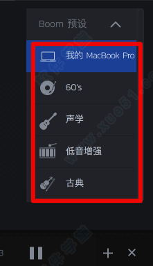 2、增强音质,设置均衡器,点击右侧的boom预设,根据自己的需要可以选择声学重低音等等的播放效果,每个选项可以精确的调节均衡。