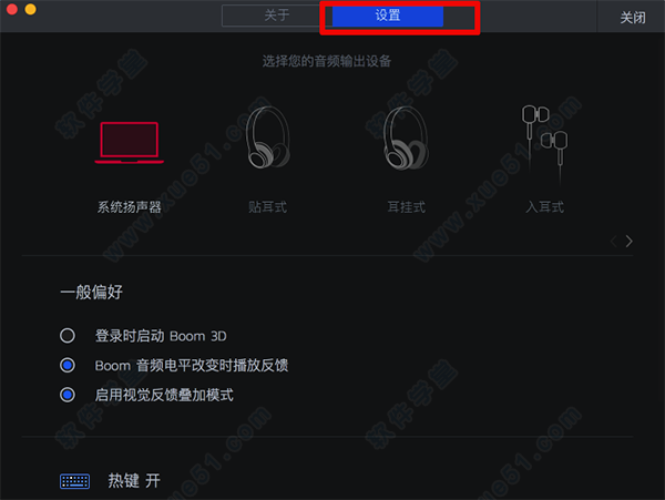 3、boom 3D的效果,一般需要耳机才可以体验到,因为只有多个音响单元才可以达到,不可能两个喇叭就可以达到的效果的,所以这里先插入耳机,然后点击设置,选择耳机。当然普通耳机或者使用本身的Mac的喇叭也可以只是效果一般般。