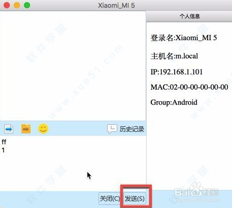 3、Mac跟手机的客户端打开后你会发现对方以及自己,local就是本地代表Mac,都出现对方以及自己就代表已经连上网了。可以进行通信发送文件等等。例如Mac向手机发送文件就点击手机的图标,如果点击local就只能自己发给自己。