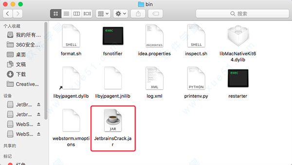 2、等待软件安装完成后先不要运行软件,回到之前打开的dmg镜像界面,打开“Crack”文件夹,将文件夹目录下的“JetbrainsCrack.jar”复制到软件的安装目录下,默认目录为【Application/WebStorm.app/Contents/bin】,如图所示: