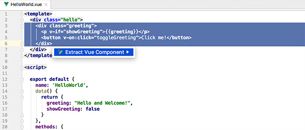 6、提取Vue组件从现有的Vue组件中创建一个新的Vue组件,而不需要任何复制和粘贴——选择模板的部分并使用Refactor - Extract或press Alt-Enter并选择Extract Vue组件。