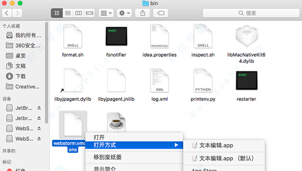 3、在当前目录下,也就是【Application/WebStorm/Contents/bin】目录下找到【webstorm.vmoptions】文件,右键选择合适的