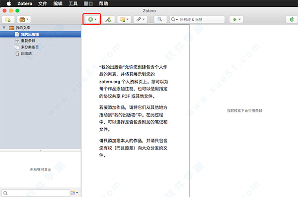 1、运行程序,针对用户自定义添加的作品,我们可以通过拖动到“我的出版物”中进行作品的加载,点击正上方“新建条目”功能图标进行条目的设置;
