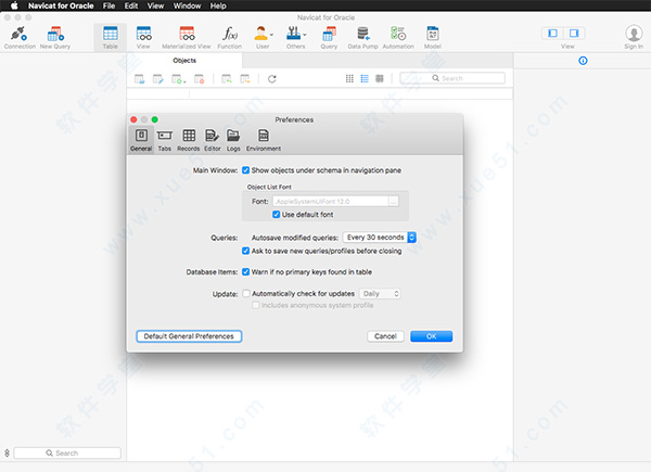 navicat for oracle 12 mac破解版是在oracle 12 mac版本的基础上将软件进行破解激活使用,免除软件功能和使用期限上的限制,另外,在新版本带来的强大功能中,包括目录、表空间、同义词、实体化视图、触发器、序列、类型等都得到了显著的优化,极大的提升了数据库本身的性能开发体验。本站提供oracle 12 for mac破解版下载,有需要的用户可以在本站下载!