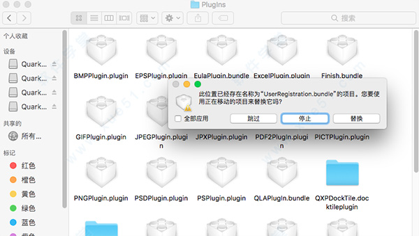5、安装完成后先不要运行软件,执行软件的破解操作,我们在【Application】中找到“QuarkXPress 2018.app”鼠标右键选择【显示包内容】-【Contents】-【Plugins】,回到之前打开的dmg镜像界面中,将“UserRegistration.bundle”和“ValidationCode.bundle”破解补丁复制到该文件目录下进行替换;