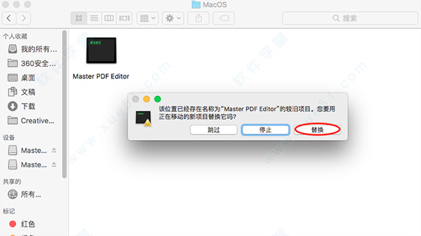 2、等待软件安装完成后先不要运行软件,回到之前打开的dmg镜像界面,打开“Crack”文件夹,将文件夹目录下的“Master PDF Editor”破解补丁复制到【Application】-【Master PDF Editor.app】-【Contents】-【MacOS】,在弹出的提示框中点击“替换”按钮完成软件的破解激活操作;