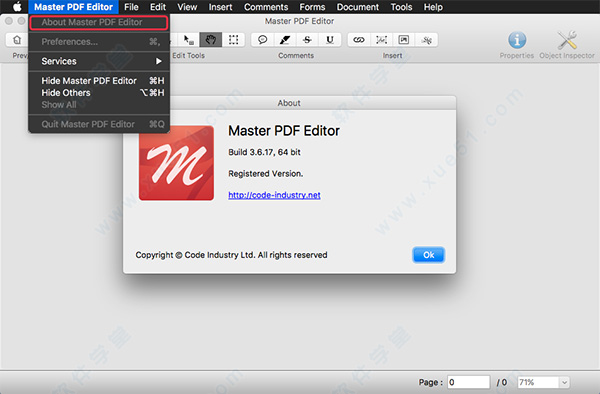 3、运行软件,点击macos菜单栏中的软件图标,在弹出的下拉框中选择“About Master PDF Editor”查看软件相关版本信息,出现下图代表软件成功注册激活使用;