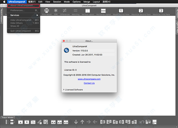 2、等待软件安装完成后运行软件,点击macos菜单栏中的软件图标,在弹出的下拉框中选择“About UltraCompareX”查看软件相关版本信息,出现下图代表软件成功注册激活使用;