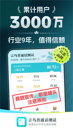 普通话测试app官方版详细的为大家提供了普通话发音测试,能够精确的为你说的普通话打分排行。其中中小学、校外教育教师不能低于二级,语文教师更是不低于二级甲等,欢迎需要的朋友来本站免费下载体验!