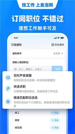 鱼泡网是一款好用的装修招工、应聘软件,该软件由成都萌瓜科技有限公司打造,是专门为工程建筑用户制作的软件,我们自己或者亲戚家中总会有需要装修的时候,这时零时去找各种水工、电工、泥工就很费时费力,价钱还贵如果,只差一个工人没有找到整个工期都无法继续做下去,下次有时间又不知道是猴年马月了。工人用户也是同理,上一个工期做完了在家闲置没事做,也不知道哪里招工怎么版办?这款软件的优势就体现出来了。