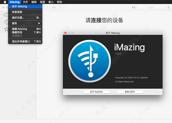 2、等待软件安装完成后运行软件,软件默认为中文语言界面,点击macos菜单栏中的软件图标,在弹出的下拉框中选择“关于iMazing”按钮查看软件相关的版本信息,出现下图代表软件成功注册激活使用;