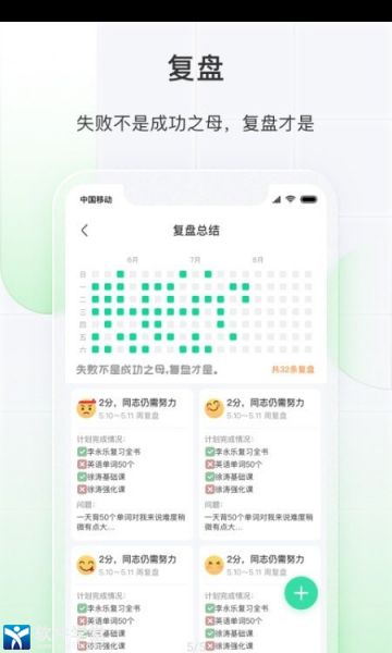 “失败不是成功之母,复盘才是”。全新复盘功能,帮助你梳理自己的计划完成情况、个人能力预估、问题分析与每日总结。