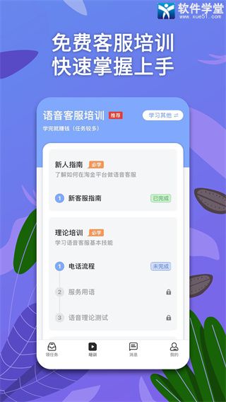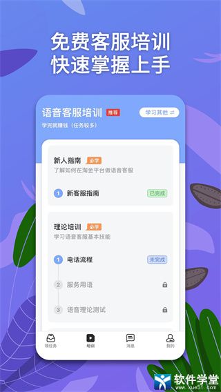 1、培训中心:学习承接客服任务所需要的知识,并通过客服考试。