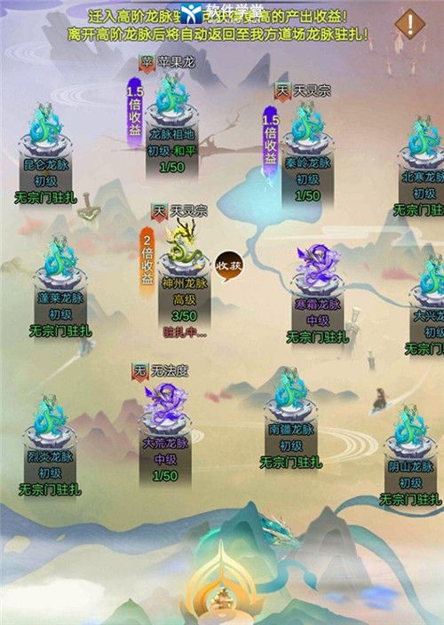 道场中龙脉分为初级,中级以及高级,中级龙脉提供1.5倍收益,高级龙脉提供2倍收益,在自身实力足够的情况下建议尽量选取品级高的龙脉进行驻扎。需要注意的是,高级龙脉由于收益比较高,有可能会被别的仙友夺取,所以在布阵时最好使用你最强的阵容,这样就不会被轻易夺取。