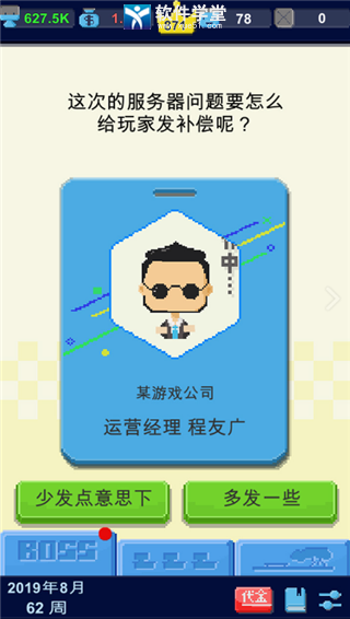 3、其实,这个游戏更大的意义在于能让我们了解游戏背后的点点滴滴,通过游戏会发现每个游戏开发者的不容易,我们玩的游戏,不管是小游戏,还是3A大作,游戏的背后都是一群志气相投的人的努力,老板不仅要考虑公司的员工的日常问题,还需要考虑用户的游戏体验,想要游戏相对完善,那就必须加班赶进度,这样对员工的心态甚至身体健康就会有影响,想要能盈利,你就得加入各种氪金系统,一但吃相难看了,就会遭到玩家的各种吐槽埋怨,所以呢,事事都是不容易的,且玩且珍惜吧~